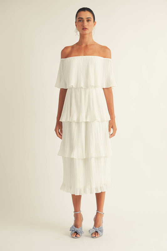 Miranda Pleated Tiered Off-Shoulder Midi Dress in Fresh Ivory