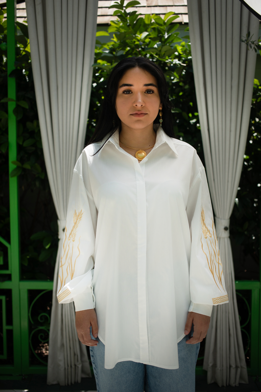 Yara Hand-Embroidered Wheat Sleeve Blouse - 100% Ivory Cotton